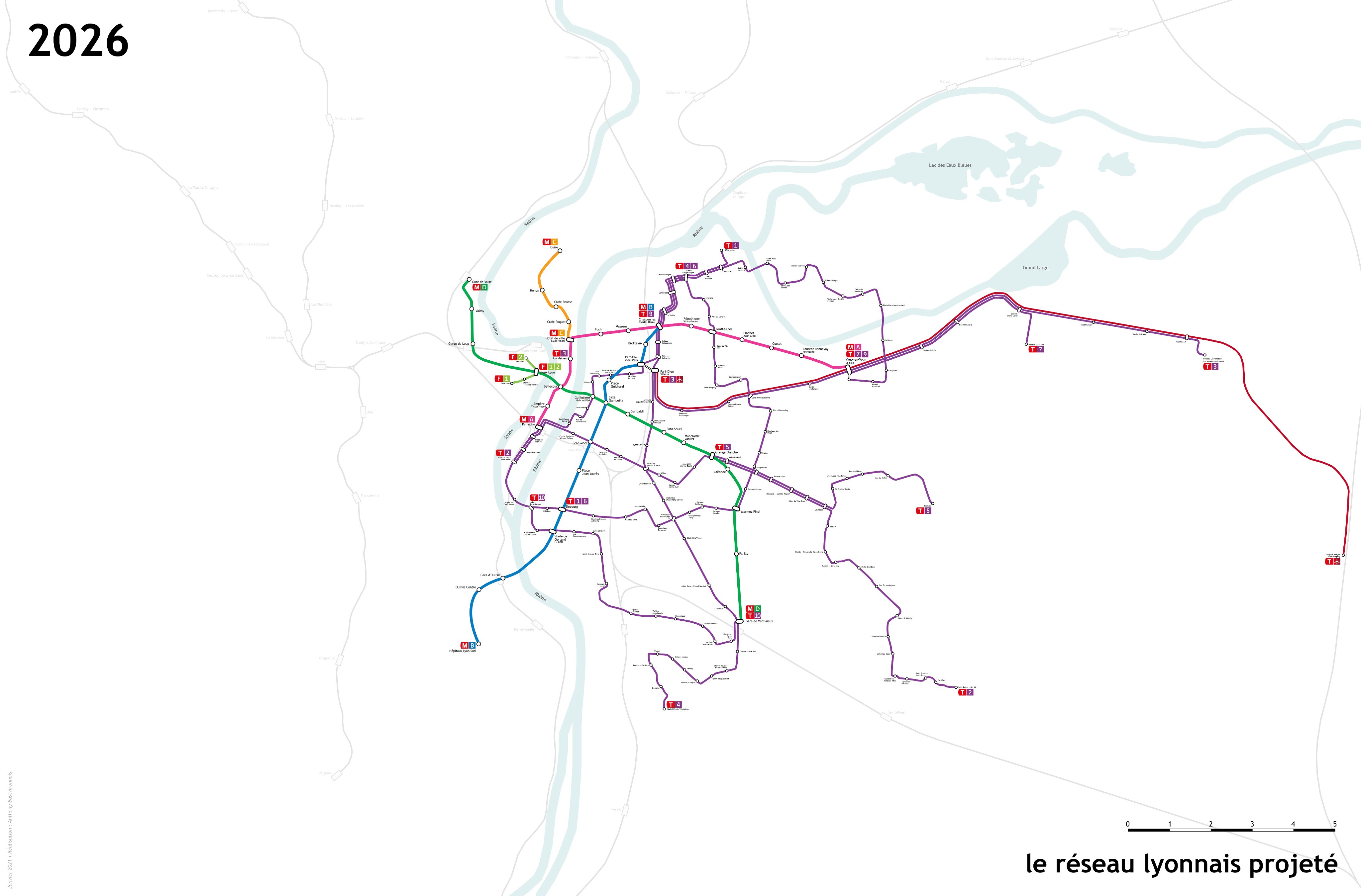 2007 war Baubeginn für eine vierte Tramwaylinie, sie verbindet die Gemeinde Vénissieux mit Lyon. An Jet d'Eau trifft sie auf die T2, von dort führt sie weiter nach Norden durch die Stadt zum Bahnhof Part-Dieu. Eine fünfte Linie wurde 2012 zur Erschließung eines Messegeländes als Abzweigung von der T2 eröffnet, die T6 ergänzt seit 2019 als südliche Tangente. Das Gleisnetz ist inzwischen knapp 84 Kilometer lang, weitere Ausbauten sind vorgesehen: neben der Verlängerung der T6 Richtung Norden (Skizze unten Mitte) und diversen Taktverdichtungen überlegt man für die Zeit nach 2026 weitere Neubaustrecken: