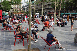 2011 begann das Projekt, die Place de la Republique neu zu gestalten und den Menschen mehr Platz einzuräumen. Der rechteckige Platz, in den sechs große Boulevards einmünden, bot früher an allen Seiten breite Fahrbahnen sowie eine Querung in der Mitte, das Denkmal stand auf einer Verkehrsinsel. Nun wurde die Nordostseite für den Busverkehr reserviert, der gesamte Mittelteil ist verkehrsfrei.