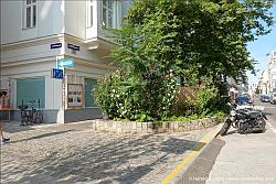 Unten: Der neue "Anger" in der Burggasse (1070). Der schmale Streifen böte sich für hochwachsende dichte Büsche an, als Abgrenzung zur vierspurigen (!) Straße; stattdessen Wiesenblumen, die nie ein nennenswertes Volumen erreichen und obendrein mit Zäunen vor Hunden geschützt werden müssen. Das Bild rechts zeigt den Altbestand einen Häuserblock weiter - das Buschwerk bietet Schatten und eine optische Abtrennung.